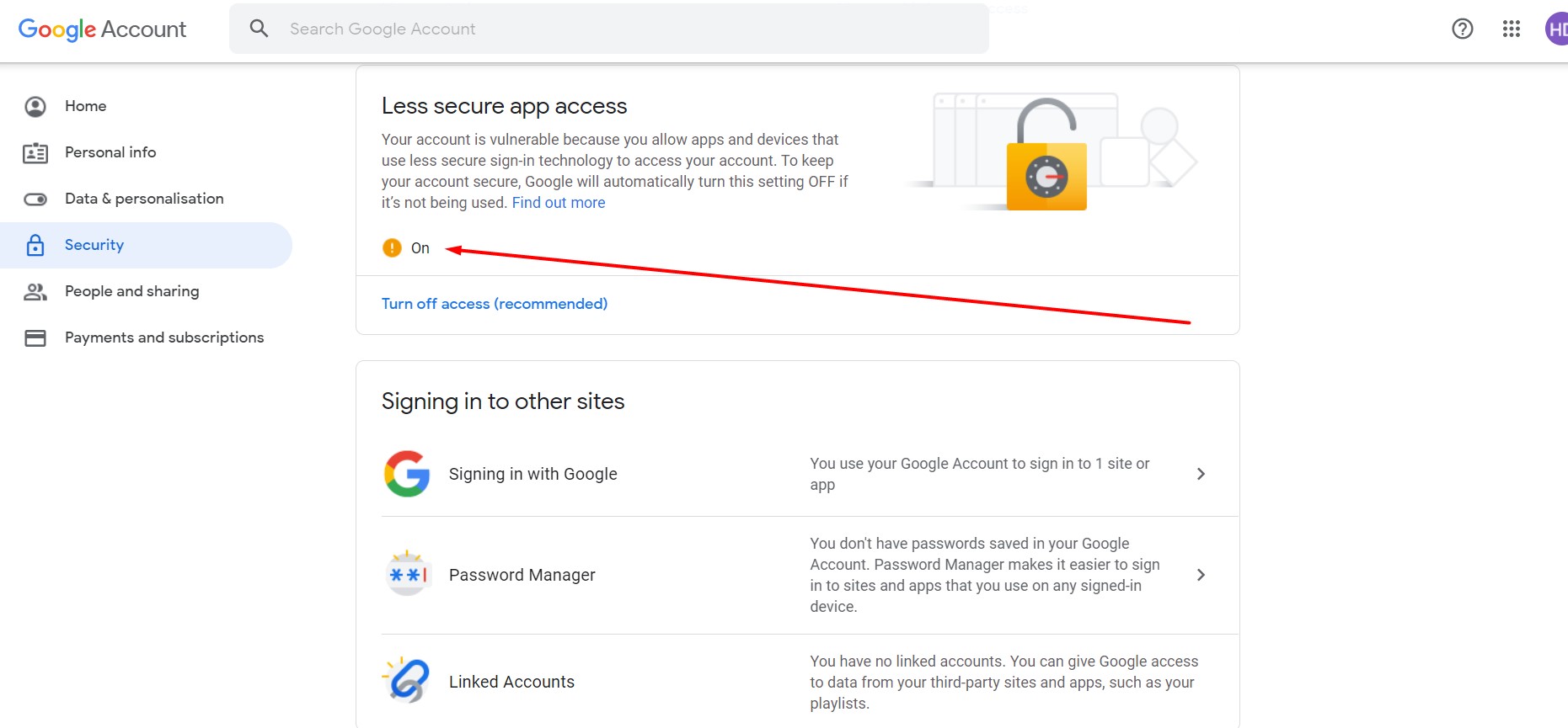 - 1.In your Google Account page, click the "Security" tab on the left sidebar.
